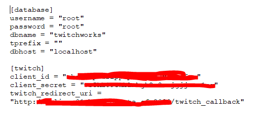 Now you have the files, head into DockerResources, and open up config.ini. Copy over your Twitch Client ID, and Twitch Client Secret from above into the client_id and client_secret fields under the twitch section respectively. Now decide the domain you're going to be giving to this docker container, and add /twitch_callback to the end. This will be your twitch_redirect_uri. An example of the docker container running at foo.bar.com would be: https://foo.bar.com/twitch_callback. Now save this file, and head back to the root directory of the TwiWorks backend.
