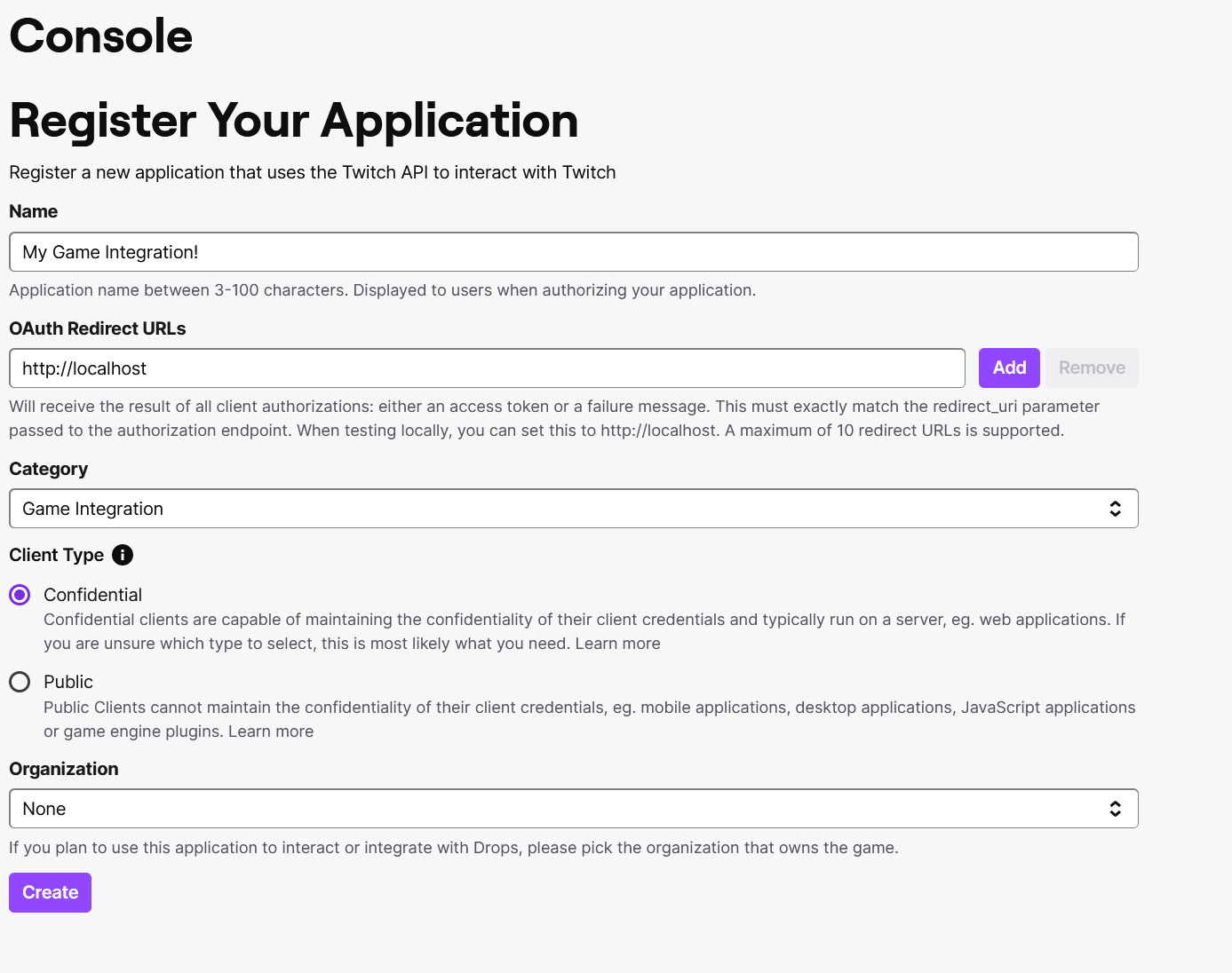 To create a Twitch application, head to the Twitch Developer Console. You'll need a Twitch account with two-factor authentication for this. Next, head to Applications > Register Your Application and fill out the form to create your Twitch application. You can use any name you want, and can use anything for your redirect URI for now (we will change this once we set up our back end). Select Game Integration under the Application Category dropdown, agree to the terms, and press the Register button.