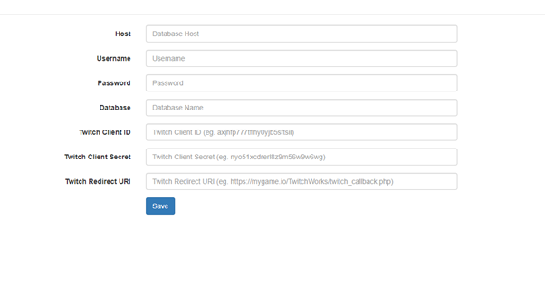 Your Twitch Client ID and Twitch Client Secret are the same as you noted down before, and your Twitch Redirect URI should be wherever you installed TwiWorks, with /twitch_callback added to the end of it. If your domain is foo.com, and you placed TwiWorks in a subdirectory called twitch, you'd end up with https://foo.com/twitch/twitch_callback. Once you've filled all these details out, hit Save, and if it gives you a success message you're almost done! If you hit a failure here, consult the error message contains any steps, and take a look at the troubleshooting section for further guidance.