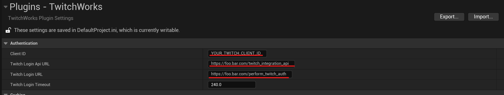 Next, we'll want to add this to the game too, so if we recall our https://foo.bar.com example from above, the following would be set under Edit > Project Settings > TwiWorks. Use your Twitch application's Client ID for the Twitch Client ID setting.