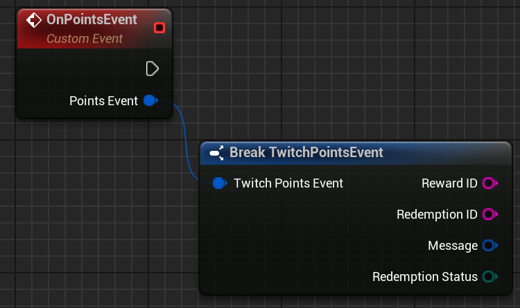 You'll likely want to play around with this node, and use the Print String node (printing the Reward ID) to figure out which Reward IDs correspond to each of your points events. Please do be aware that these reward identifiers will differ between channels. This means that if you're distributing your game to an audience of streamers with access to the channel points system, that you'll likely want to create a system where the streamer can set up their points event.